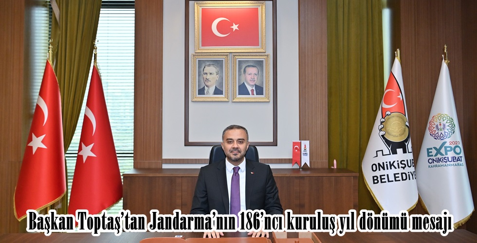 Jandarma Teşkilatı’nın 186’ncı kuruluş yıl dönümü dolayısıyla mesaj yayımlayan Onikişubat Belediye Başkanı Hanifi Toptaş, “Ülkemizin dört bir yanında olduğu gibi, Kahramanmaraş ve Onikişubat’ımızda milletimizin huzuru ve güvenliği için gece gündüz demeden fedakârca görev yapan Jandarma Genel Komutanlığımızın 186’ncı kuruluş yıl dönümünü kutluyorum” dedi.