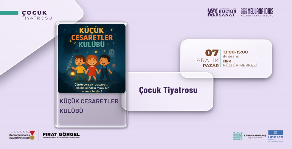 Şehirde kültür sanat faaliyetlerini çeşitlendirerek sürdüren Kahramanmaraş Büyükşehir Belediyesi, Mevlâna İdris Kültür Sanat Sezonu kapsamında çocuklara yönelik etkinliklerine de kesintisiz devam ediyor. Bu kapsamda, 7 Aralık Pazar günü sahnelenecek “Küçük Cesaretler Kulübü” adlı çocuk tiyatrosu, Necip Fazıl Kısakürek Kültür Merkezi’nde minik sanatseverlerle buluşacak. Saat 13.00 ve 15.00’da gerçekleştirilecek iki gösterimle minik sanatseverler tiyatronun büyülü dünyasına adım atacak. Gösteri, çocuklara yalnızca keyifli bir hafta sonu sunmakla kalmayacak; aynı zamanda onların cesaret kazanma yolunda eğlenceli ve öğretici bir yolculuğa çıkmalarına vesile olacak. İlham verici hikâyeler, macera dolu sahneler ve eğlenceli karakterlerle dolu oyun, çocukların hayal gücünü güçlendirecek. Büyükşehir Belediyesinden yapılan açıklamada ilham verici, eğlenceli ve macera dolu olayları konu alan gösteriye tüm çocuklar davet edildi.