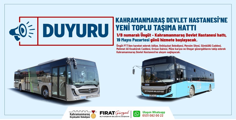 Büyükşehir Belediyesi, Onikişubat Üngüt Mahallesi’nden Kahramanmaraş Devlet Hastanesi’ne ulaşım sağlayacak yeni toplu taşıma hattının 19 Mayıs Pazartesi günü hizmete başlayacağını duyurdu.