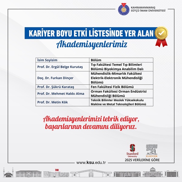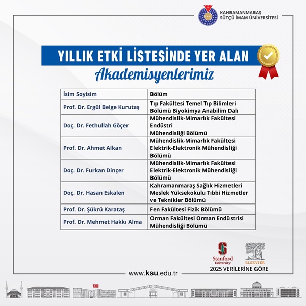 Kahramanmaraş Sütçü İmam Üniversitesi (KSÜ) olarak Stanford Üniversitesinden bilim insanları tarafından her yıl hazırlanan ve bilim dünyasında büyük saygınlığa sahip olan “Dünyanın En Etkili Bilim İnsanları” listesi yayımlandı.