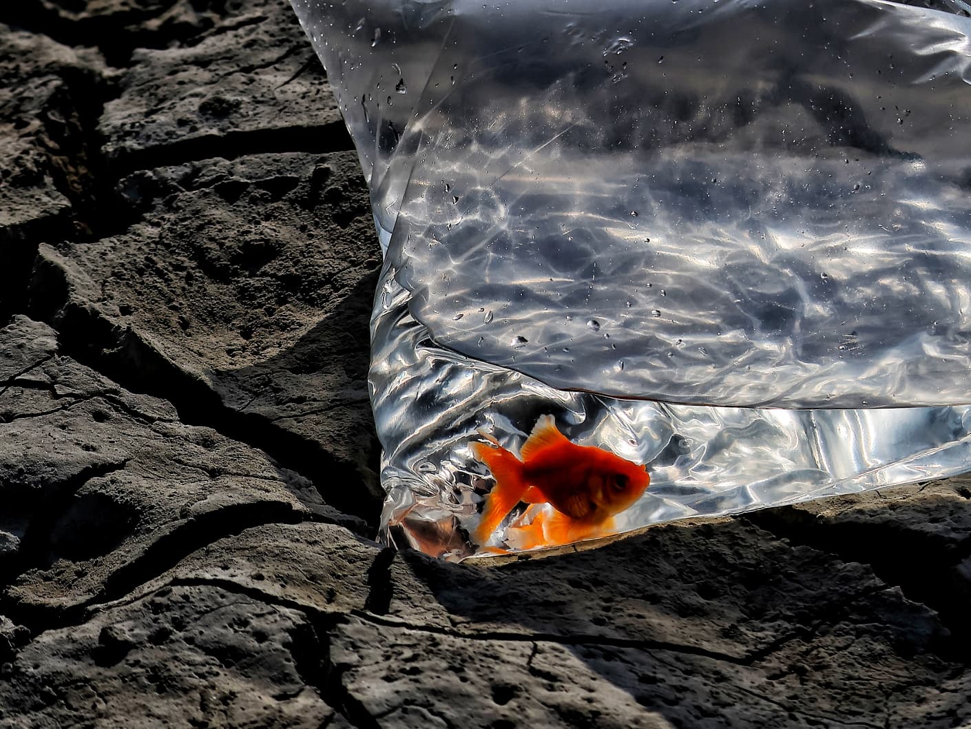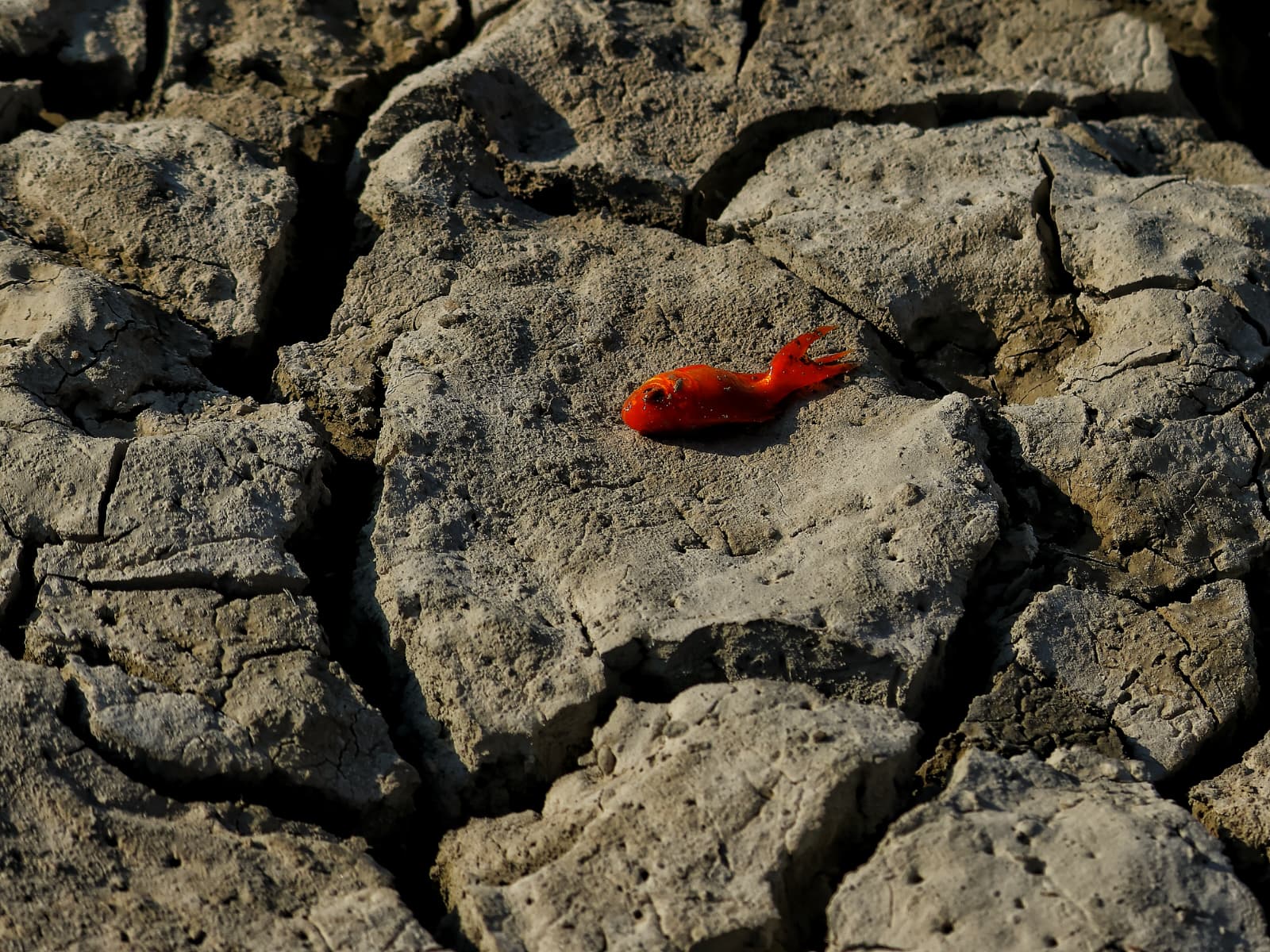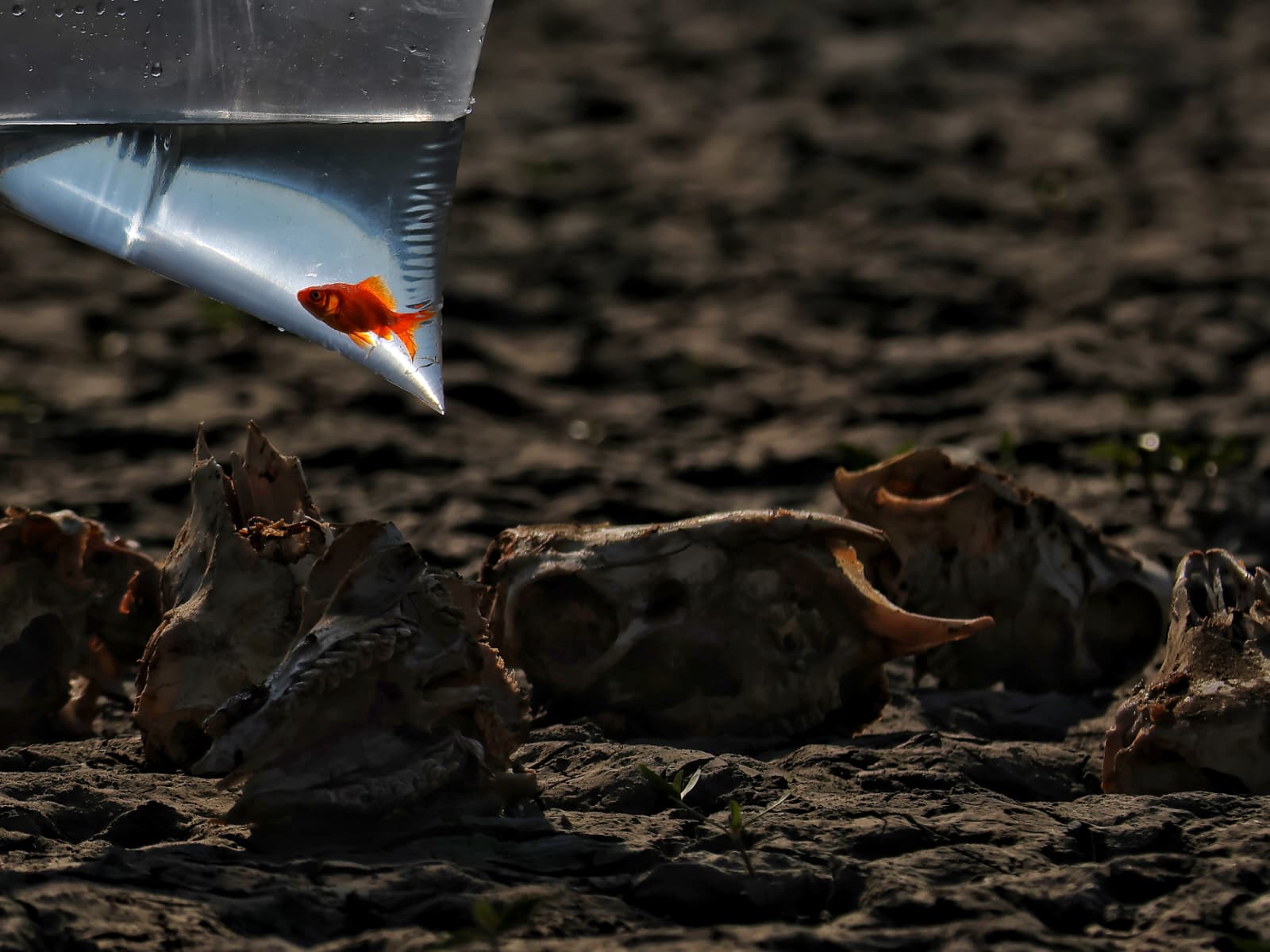 Toprak çatlamış, yaşam izleri silinmiş, hayvan kafatasları kuraklığın izlerini sessizce sergiliyor. Bu karanlık tablonun tam ortasında ise küçük bir plastik poşetin içine sıkışmış kırmızı bir balık… İnsanlığın doğayla kurduğu dengesiz ilişkinin, iklim krizinin ve umudun aynı karede buluştuğu çarpıcı bir fotoğraf.