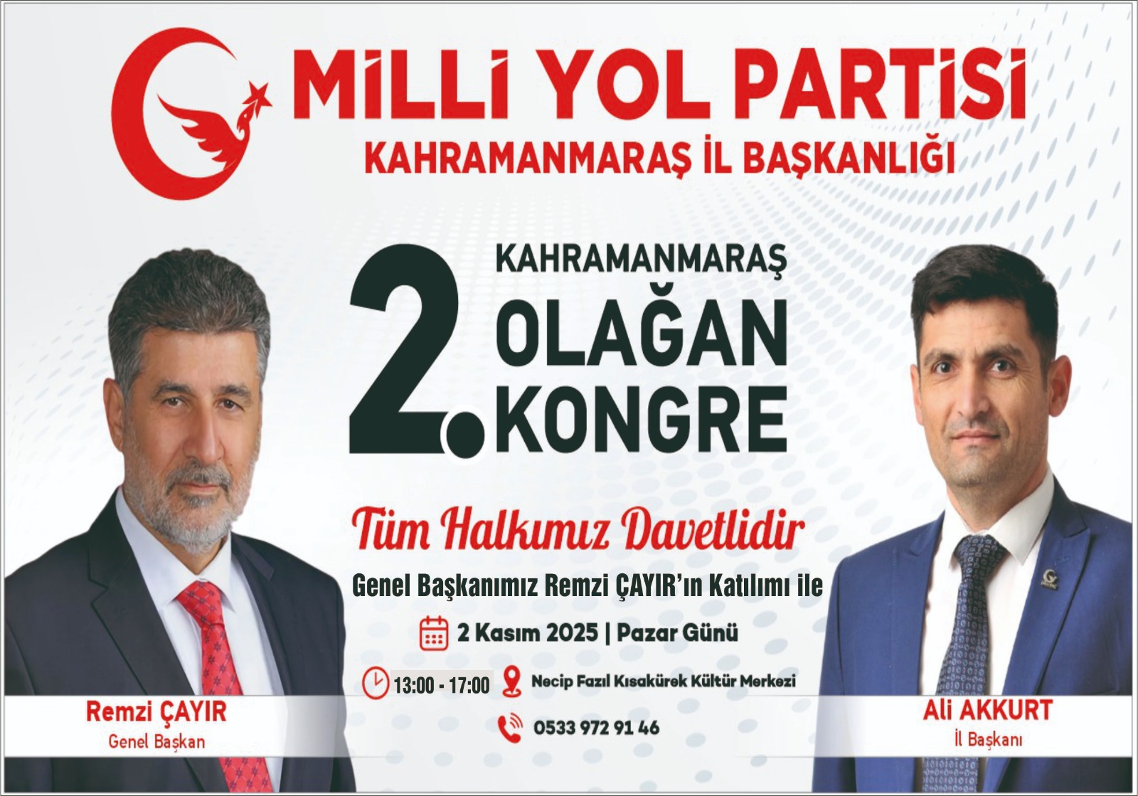 Milli Yol Partisi Kahramanmaraş İl Başkanı Ali Akkurt, 2 Kasım 2025 Pazar günü gerçekleşecek olan Milli Yol Partisi Kahramanmaraş İl Kongresine tüm hemşehrilerimizi davet etti.