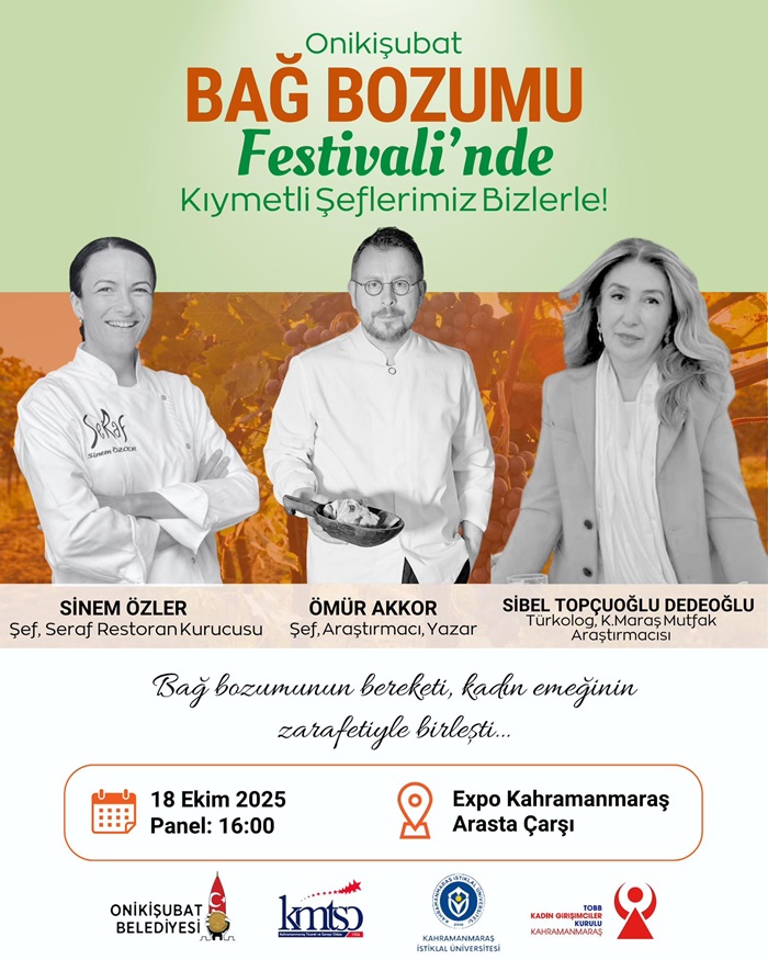 Onikişubat Belediyesi, ilçenin bereketli topraklarını, kadın emeğini ve gastronomi zenginliğini bir araya getirecek anlamlı bir etkinliğe imza atıyor. Ünlü şefler Ömür Akkor ve Sinem Özler’in katılımıyla gerçekleşecek Onikişubat Geleneksel Bağ Bozumu Festivali, 18-19 Ekim 2025 tarihlerinde EXPO Arasta Çarşısıı’nda vatandaşlarla buluşacak.