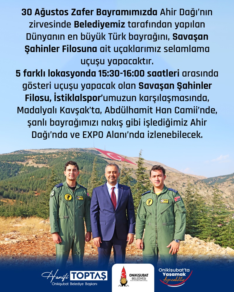 30 Ağustos günü saat 15.30 – 16.00 arasında gerçekleşecek olan gösteri uçuşu, Kahramanmaraş’ın birçok noktasında aynı anda izlenebilecek. İstiklalspor’un karşılaşmasında tribünleri dolduran taraftarlar, Madalyalı Kavşak’ta toplanan vatandaşlar, Abdülhamit Han Camii çevresinde bayram coşkusuna ortak olan kalabalıklar ve EXPO Alanı’nı dolduracak misafirler bu tarihi anı gökyüzünden takip edebilecek. En özel görüntüler ise hiç kuşkusuz Ahir Dağı’nın zirvesinde, şanlı bayrağımızın işlendiği yerde yaşanacak.