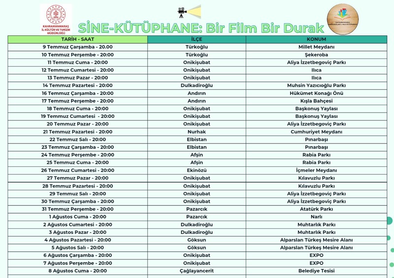 Kahramanmaraş İl Kültür ve Turizm Müdürlüğümüz tarafından hayata geçirilen “Sine-Kütüphane: Bir Film, Bir Durak” projesi kapsamında, ilçelerde açık hava sinema gösterimleri başlıyor.