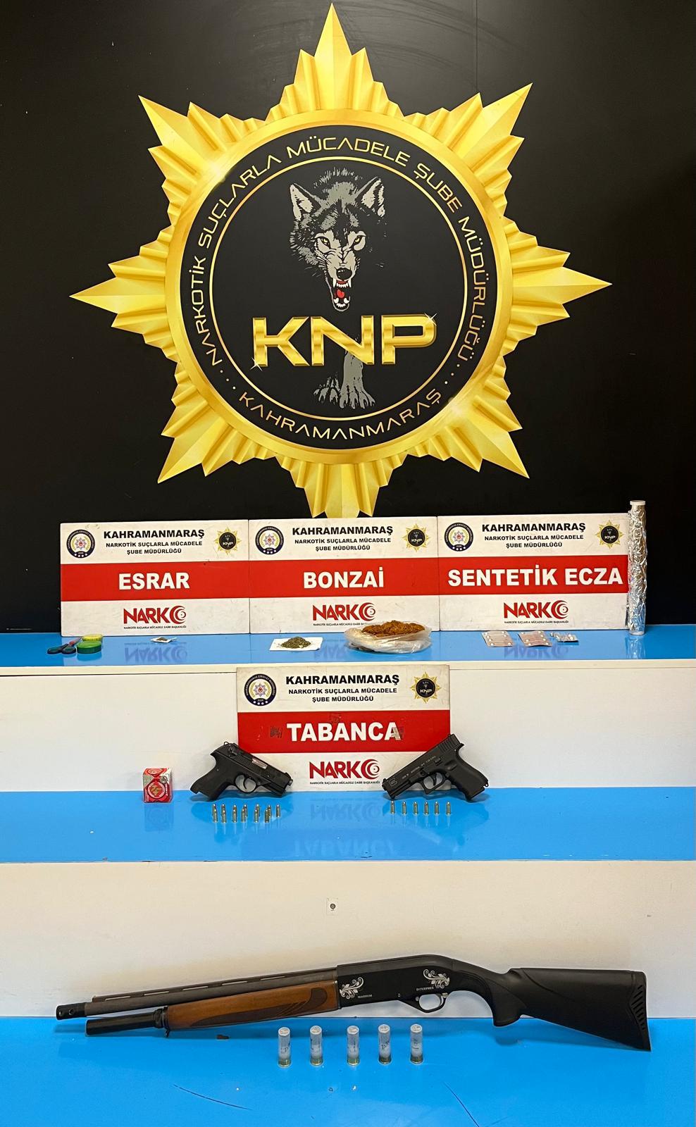 Kahramanmaraş İl Emniyet Müdürülüğü Narkotik Suçlarla Mücadele Şube Müdürlüğü görevlilerince ilimiz Cumhuriyet Başsavcılığı koordinesinde yapılan çalışmalar sonucu uyuşturucu madde ticareti yaptığı tespit edilen B.L. isimli şahıs 88.44 gr Sentetik Kannabinoid (Bonzai) Maddesi, 16 adet Sentetik Ecza Hapı, 0,37 gr Esrar Maddesi, 2 adet tabanca, 19 adet tabanca Fişeği, 1 adet av tüfeği, 5 adet av tüfeği kartuşu, 1 adet folyo rulosu, 1 adet makas, 1 adet aseton ve 1 adet sakız kutusu ile birlikte suçüstü yakalandı.