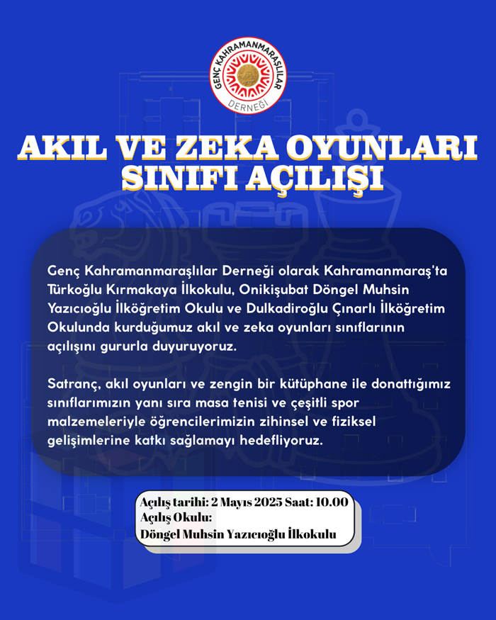 Ankara’da faaliyet gösteren Genç Kahramanmaraşlılar Derneği, eğitime verdiği desteği sürdürerek çocukların zihinsel ve sosyal gelişimine katkı sunacak önemli bir projeyi daha hayata geçiriyor. Dernek gönüllüleri ve bağışçılarının katkılarıyla Kahramanmaraş’ın Türkoğlu, Onikişubat ve Dulkadiroğlu ilçelerinde bulunan üç farklı okulda akıl ve zekâ oyunları sınıfları kuruluyor.